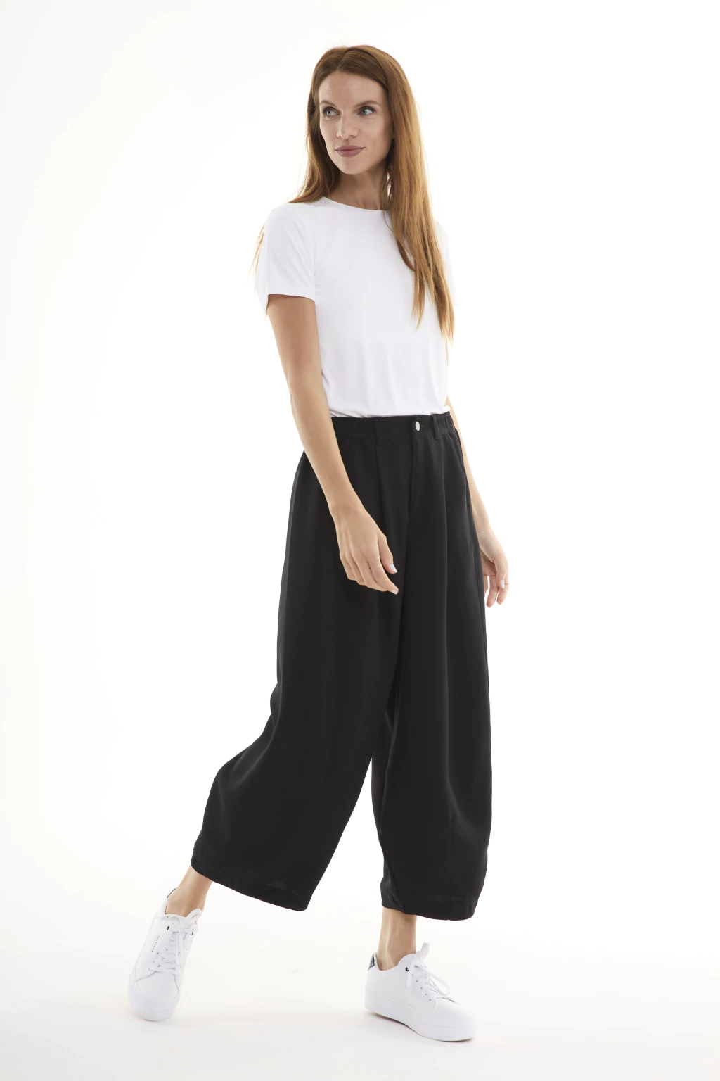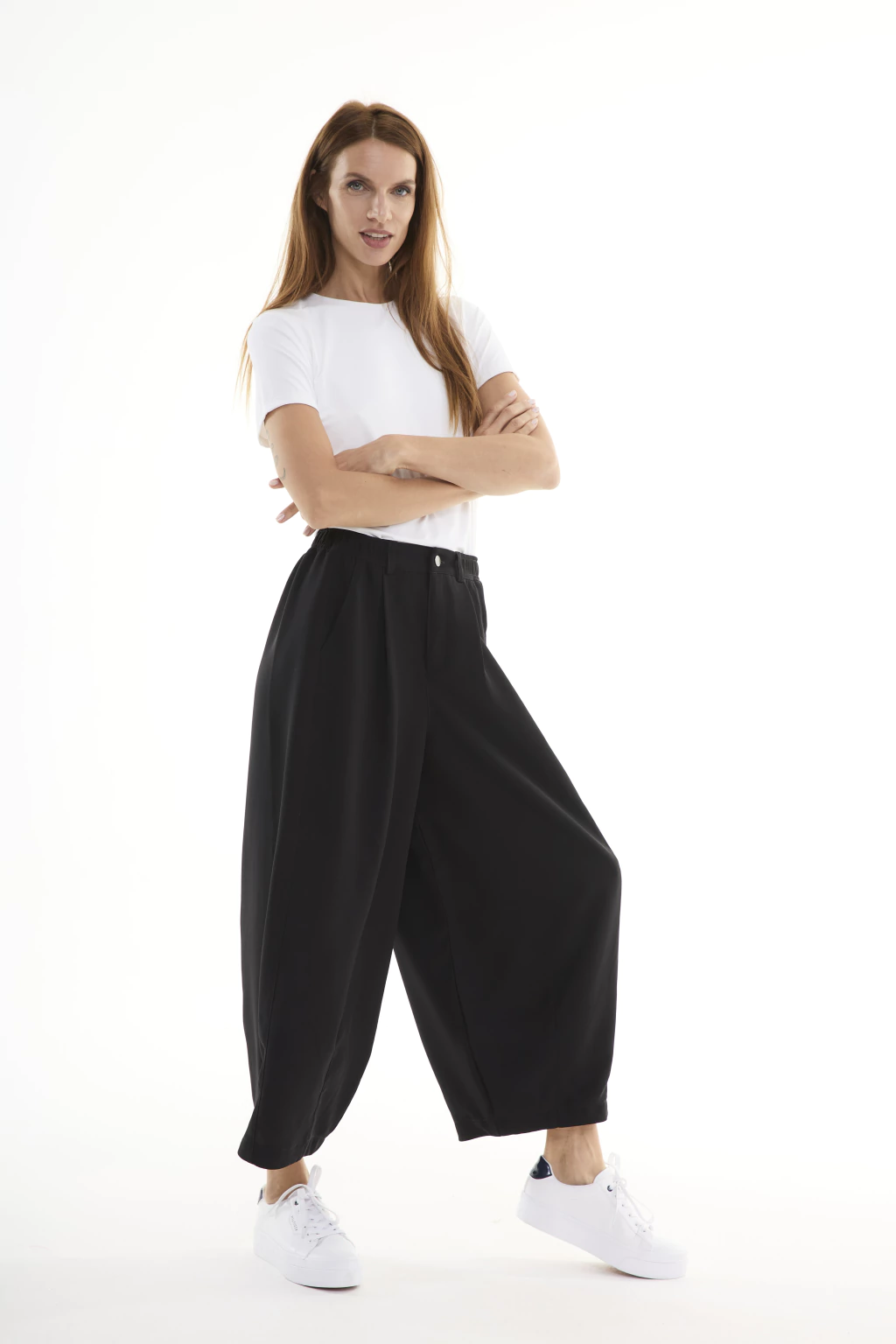 Pantalón tipo globo pinzado, de tiro alto, confeccionado en twill sastrero elastizado negro. Cuenta con cintura con elástico y pasacinto, lo que asegura un calce cómodo y adaptable.