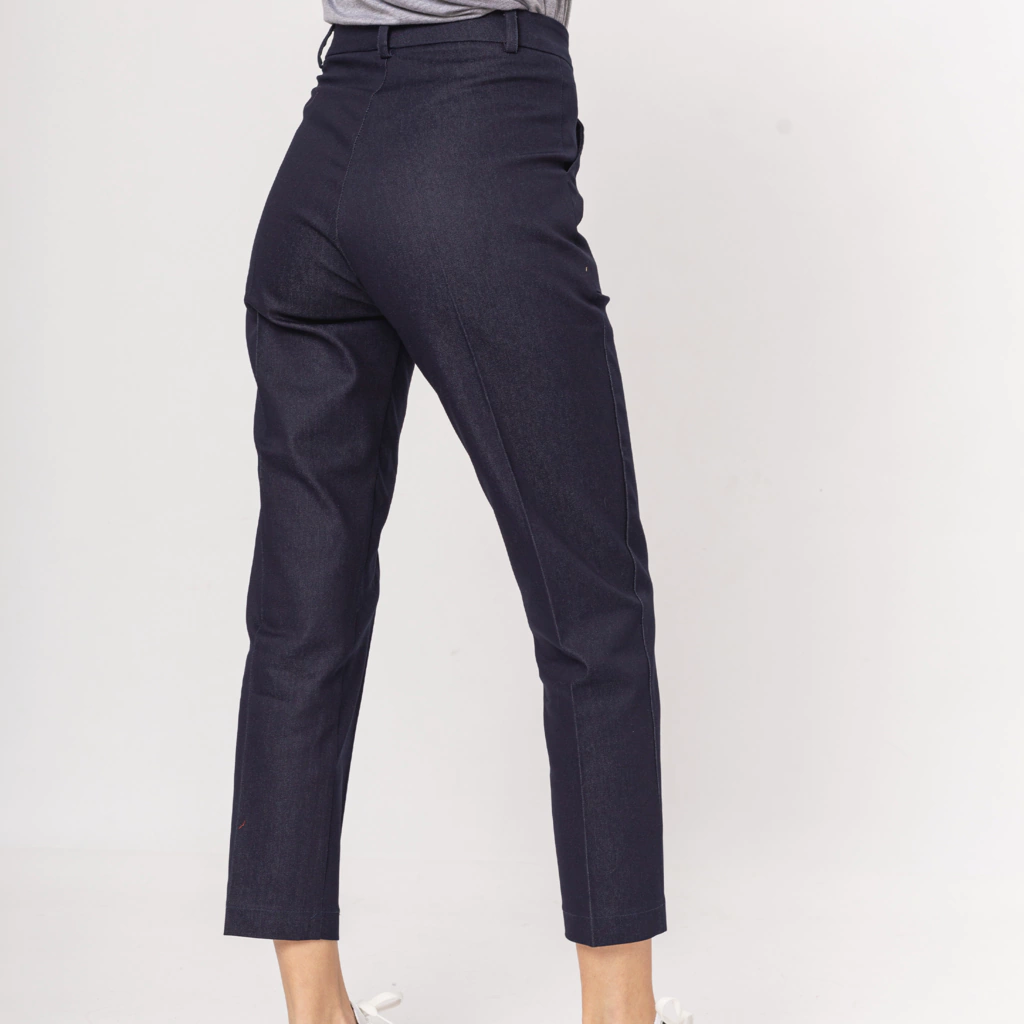 Pantalón de simil jean de corte recto achupinado, tiro medio alto y con bolsillos delanteros.