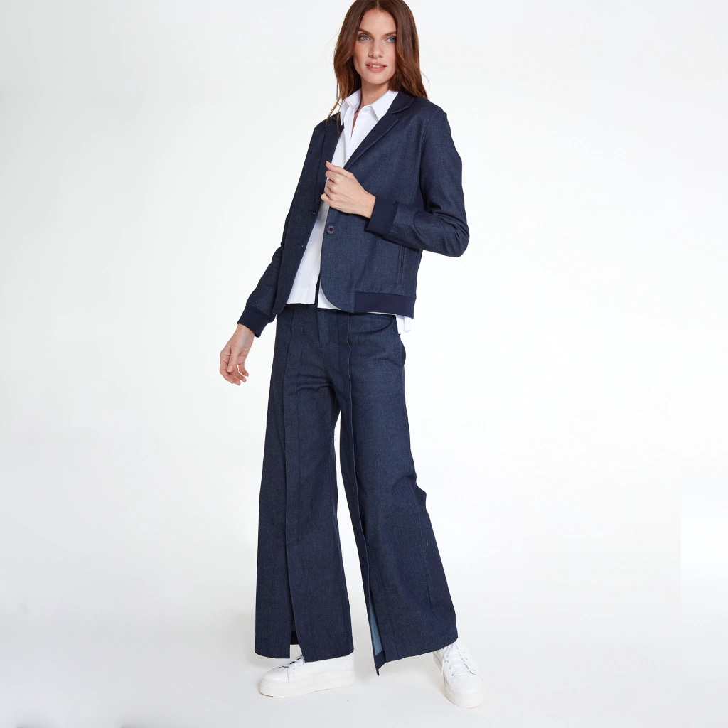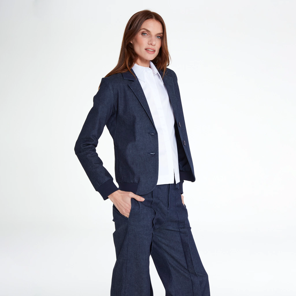 BLAZER CAMPERA JEAN AZUL, CON CUELLO Y SOLAPA, CON RIB DE ALGODON EN PUÑO DE MANGA Y CINTURA. BOLSILLO LATERAL. TELA PRINCIPAL: JEAN AZUL ELASTIZADO TELA COMPLEMENTARIA: RIB ALGODON AZUL FORRERÍA: ACETATO LARGO DE PRENDA: 60 CM
