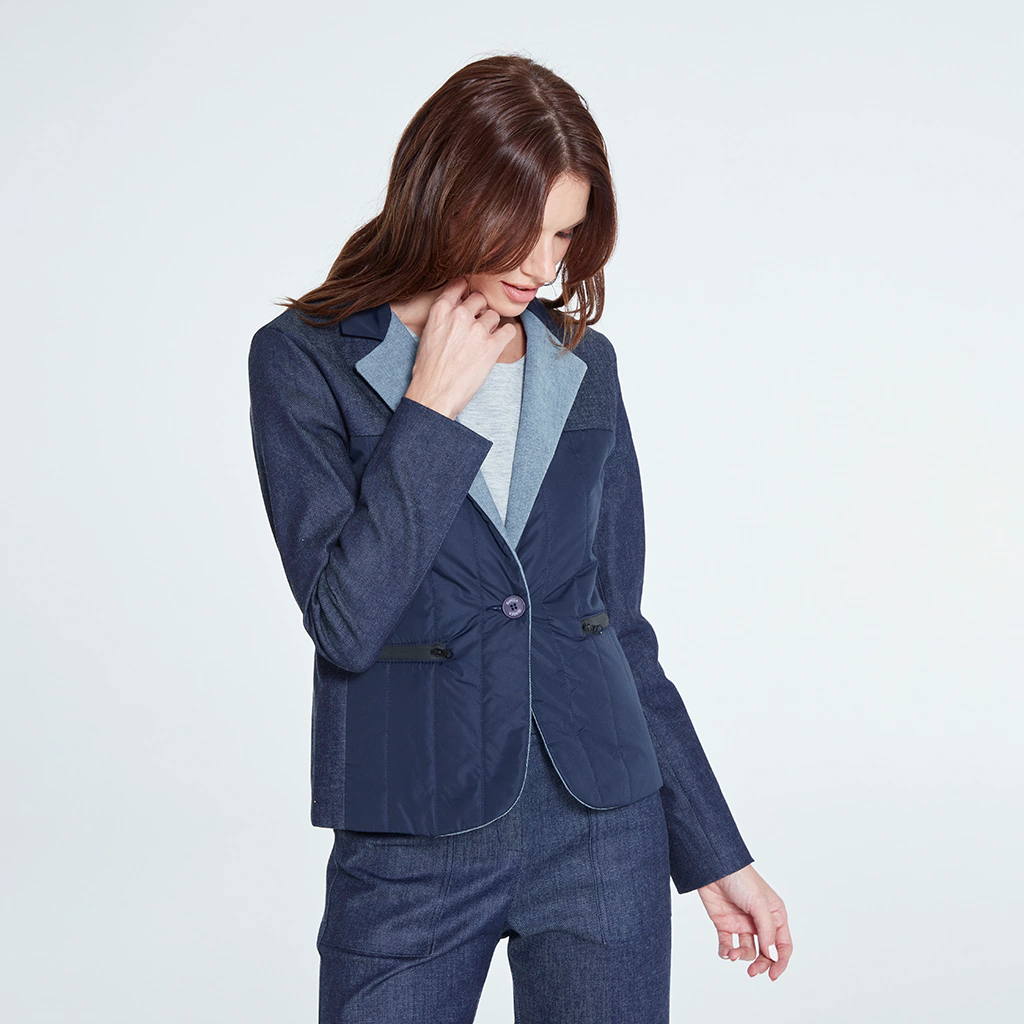 BLAZER CUELLO Y SOLAPA EN JEAN AZUL, COMBINADO CON SIRE AZUL OPACO RELLENO DE GUATA SILICONADA, CON BOLSILLOS CON CIERRE INVISIBLE DELANTERO