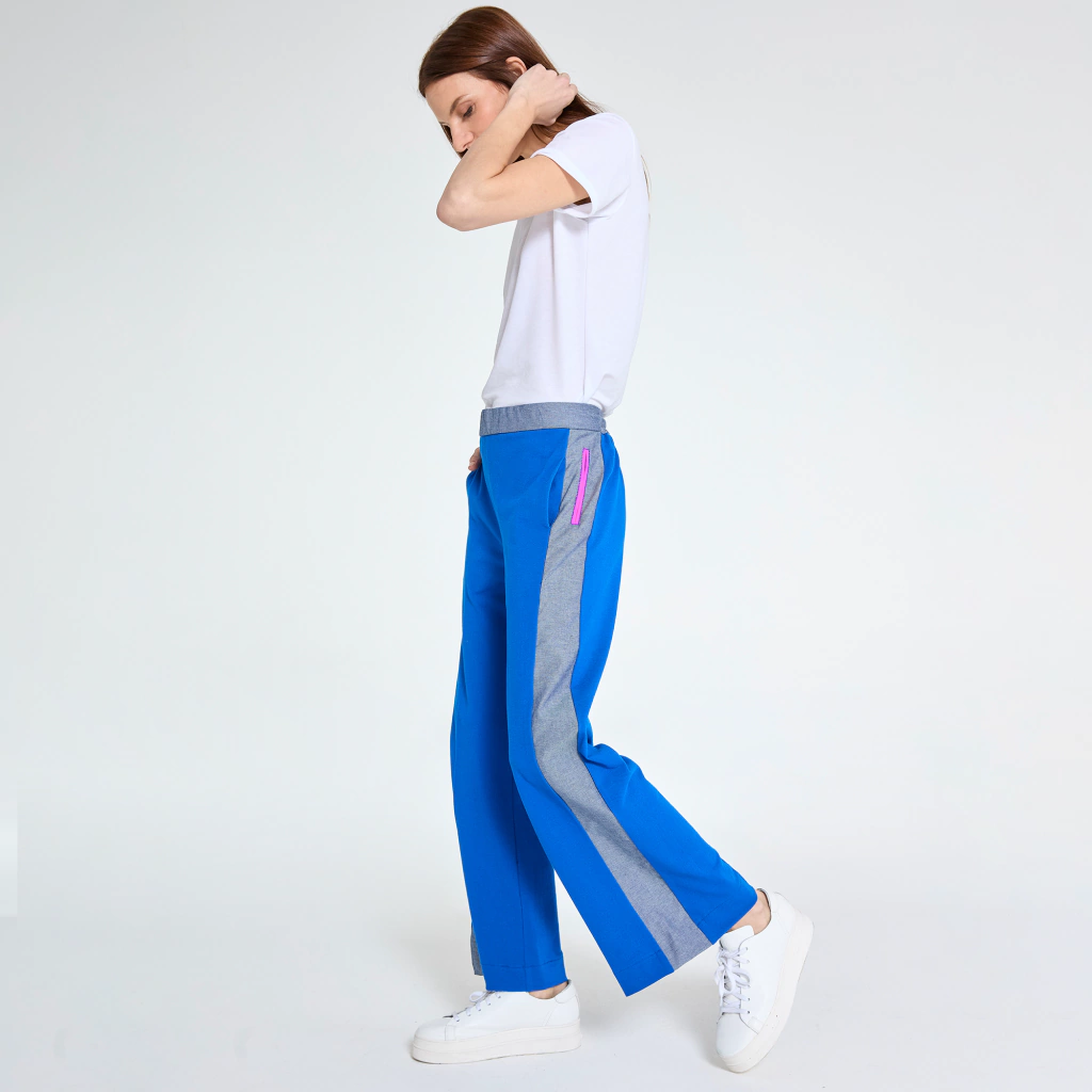 PANTALÓN ELASTIZADO TIRO MEDIO ALTO, CON RECORTE LATERAL A CONTRATONO, CON BOLSILLOS DELANTERLOS BITONO, CINTURA ELASTIZADA CON AJUSTE INTERNO, DE CORTE ANCHO.