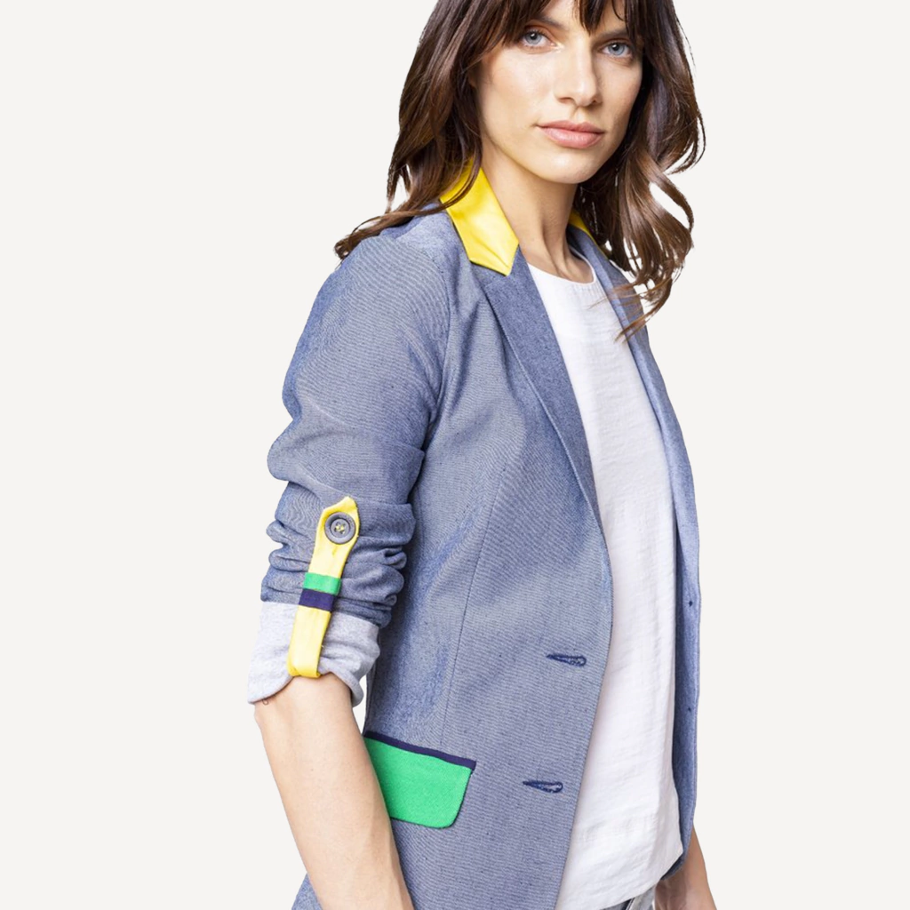 Blazer en frisa rústica simil jean combinado con detalles en verde y amarillo.