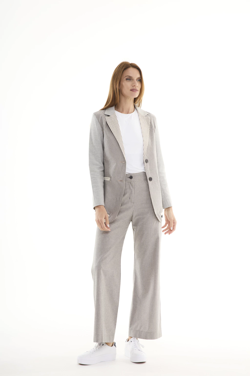 La prenda cuenta con un cierre con botón peltre, sumando un detalle distintivo al diseño. Confeccionado en lino rayado gris, este pantalón es liviano, fresco y perfecto para lucir en cualquier temporada.