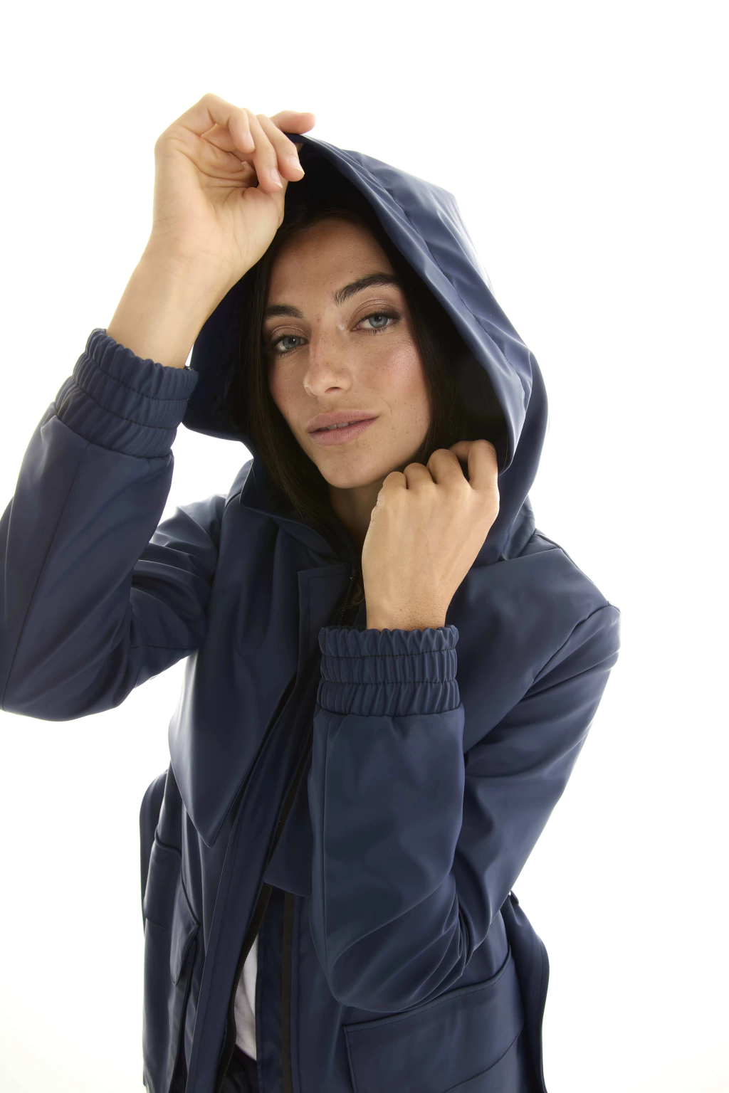 CAMPERON IMPERMEABLE, CON CAPUCHA, CON BOLSILLO PLAQUE GRANDE, CINTURÓN, Y PUÑO ELASTIZADO EN LA CINTURA Y MANGA