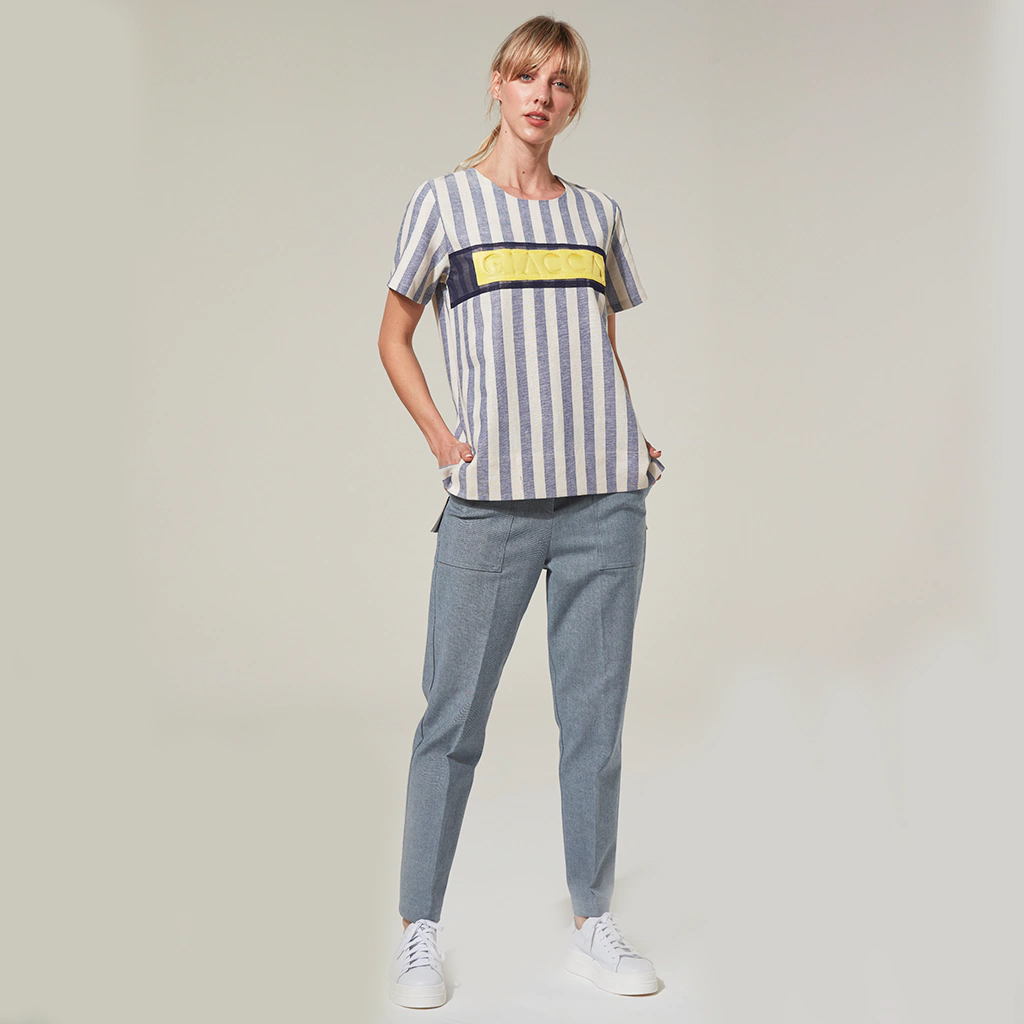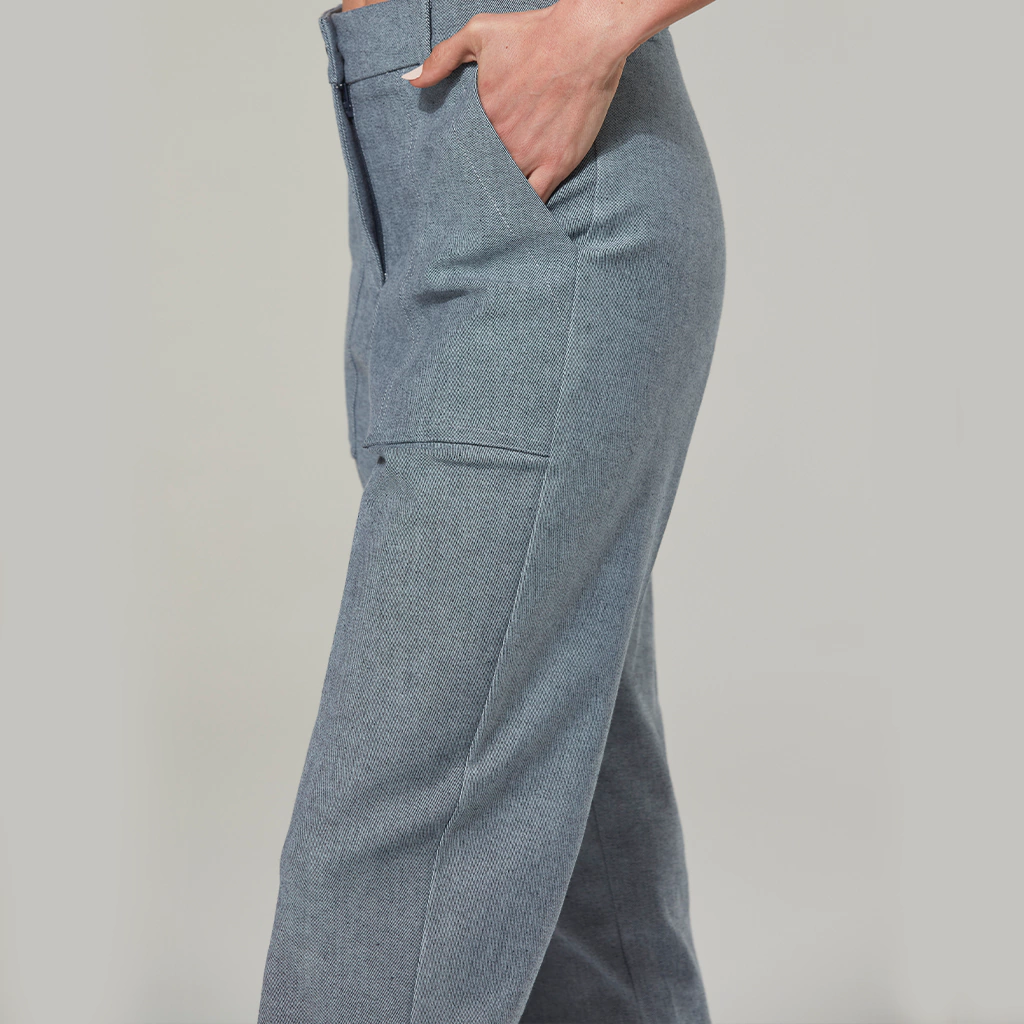 PANTALÓN ELASTIZADO TIRO ALTO, DE CORTE RECTO ACHUPINADO, CON BOLSILLOS DELANTEROS CON PESPUNTE EN LA COSTURA, Y CON PRESILLA PASACINTO EN CINTURA. CIERRE CON BOTÓN PELTRE.