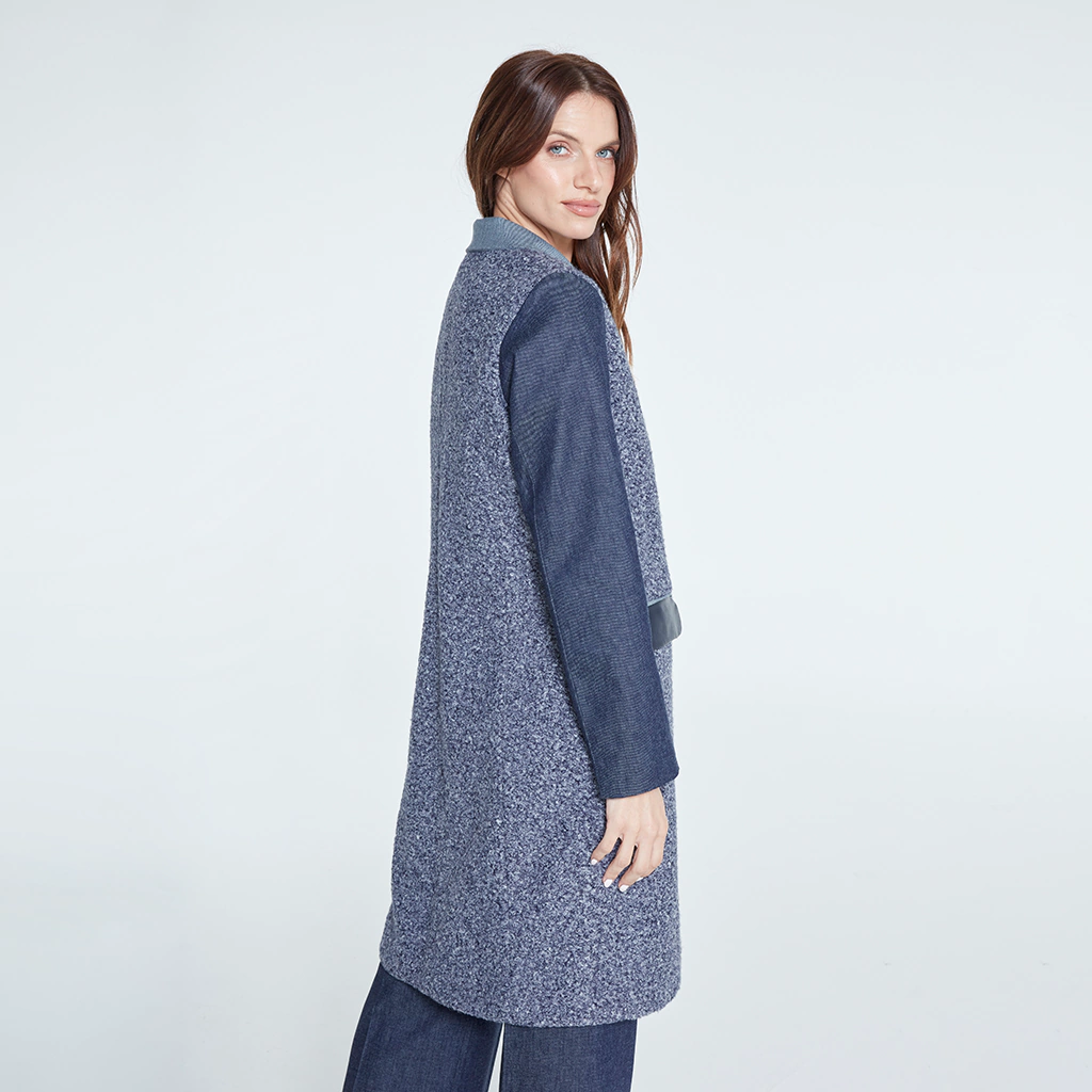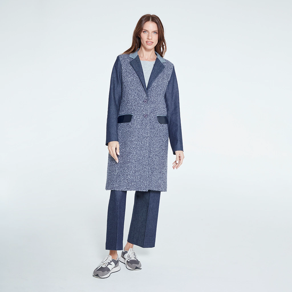 TAPADO CUELLO Y SOLAPA EN JEAN AZUL COMBINADO CON PAÑO JASPEADO Y DETALLES EN CUERO AZUL