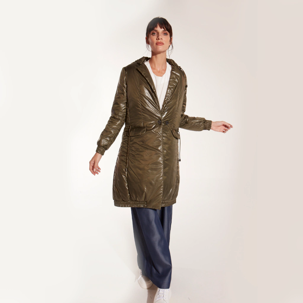 ABRIGO CUELLO Y SOLAPA, EN SIRE VERDE MILITAR, RELLENO CON GUATA SILICONADA, CON ELÁSTICO INTERNO EN CINTURA PARA AJUSTAR CON TANCAS, PUÑO DE MANGA Y CINTURA ELASTIZADO. BOLSILLOS DELANTEROS Y CAPUCHA DESMONTABLE.