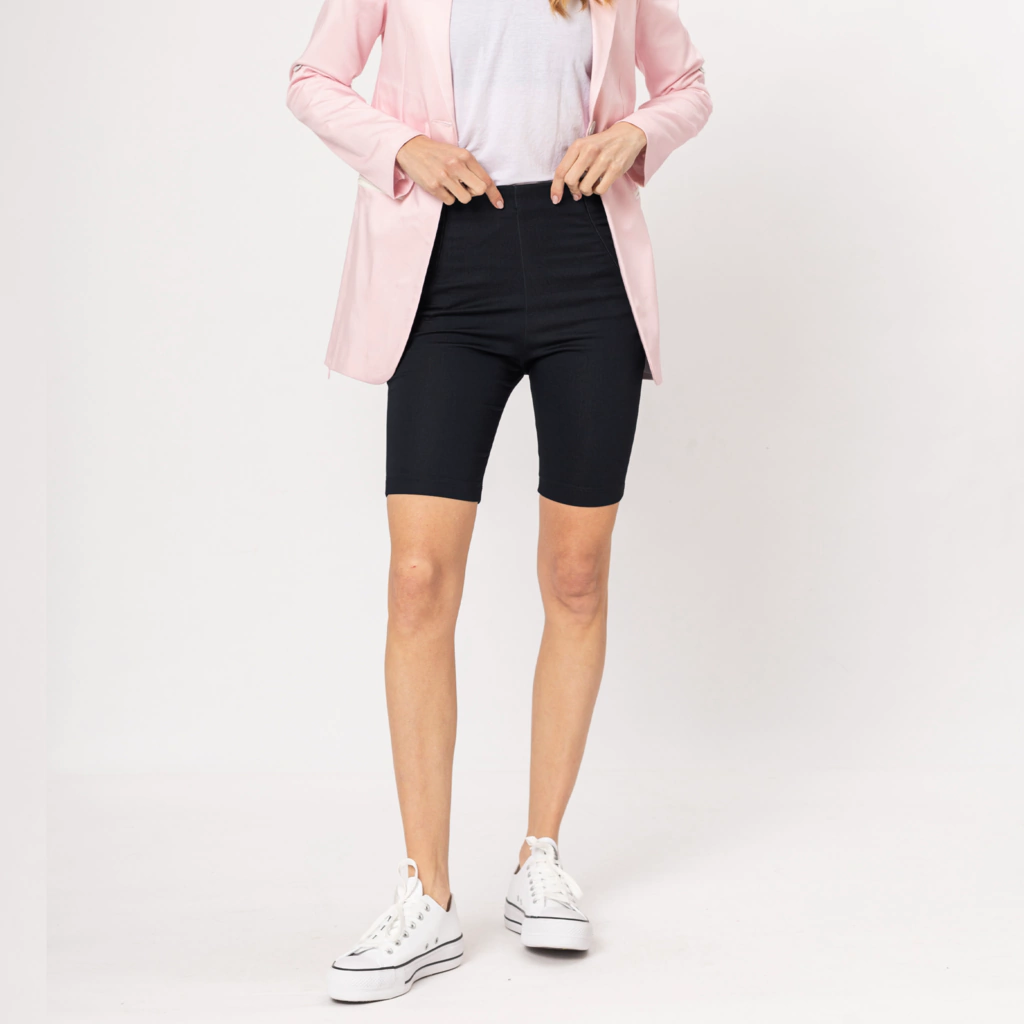 Biker tiro alto elatizado con doble cierre delantero de gabardina satinada negra.