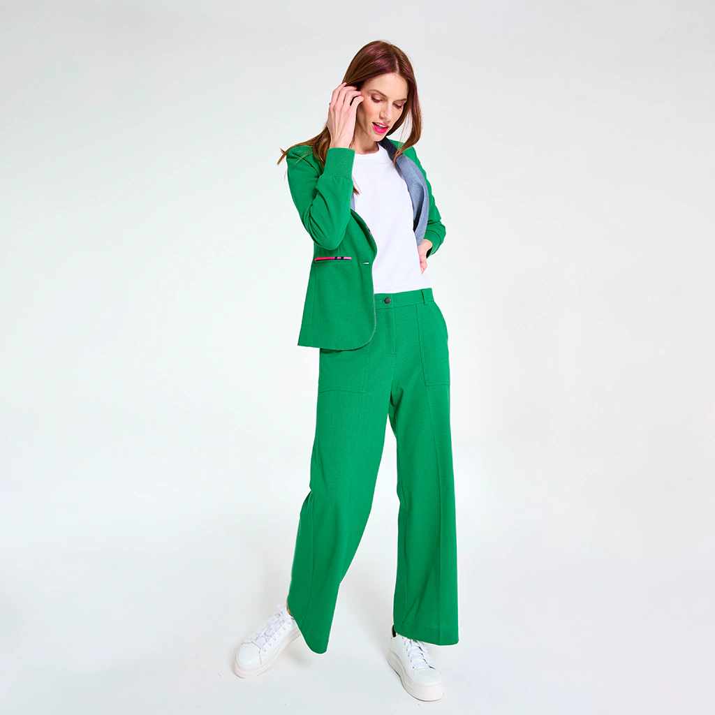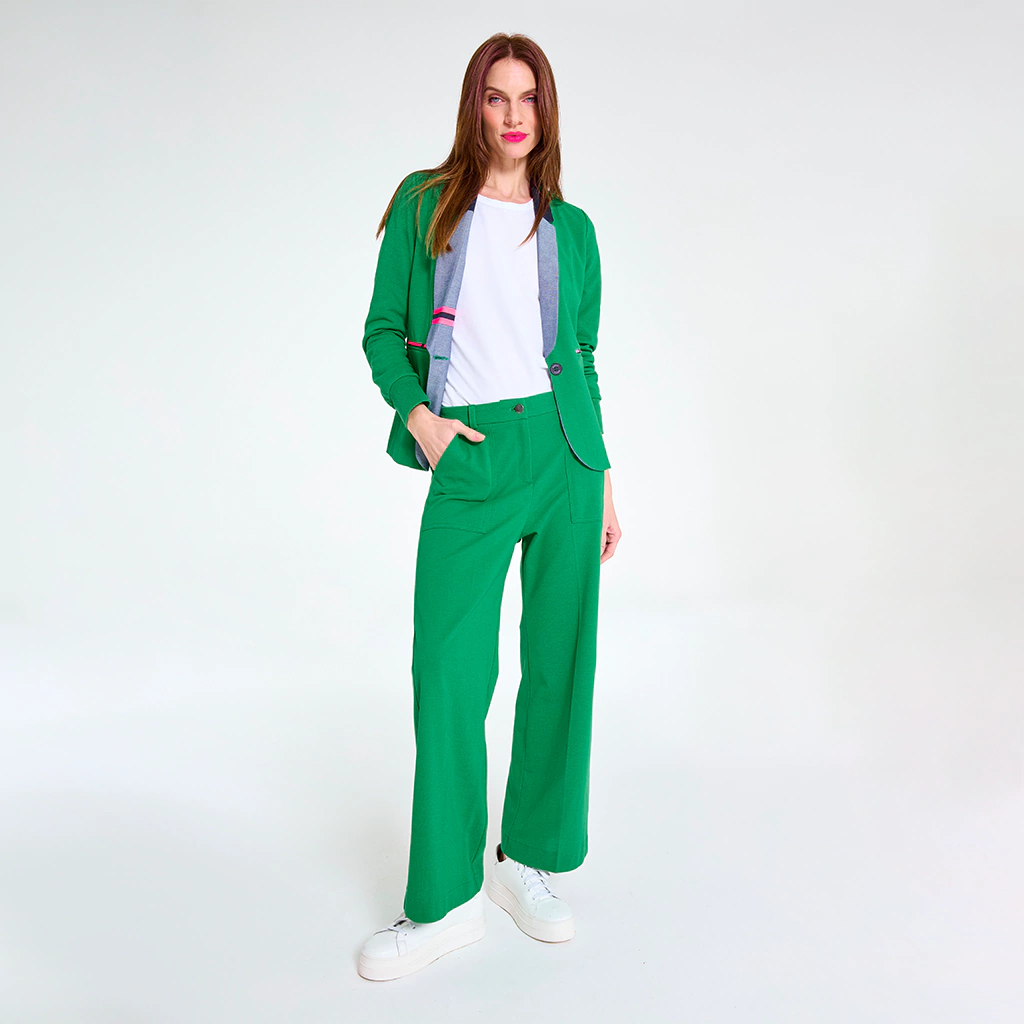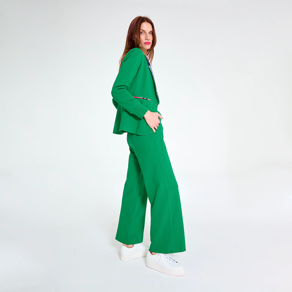 PANTALÓN TIRO ALTO, CON ELASTICO CINTURA TRASREA, BOTAMANGA ANCHA, CON BOLSILLOS DELANTEROS CON PESPUNTE EN LA COSTURA, Y CON PRESILLA PASACINTO EN CINTURA. CIERRE CON BOTÓN PELTRE. TELA: PIQUE VERDE BENETTON LARGO DE PRENDA: 105 CM ANCHO DE BOTAMANGA: 28 CM