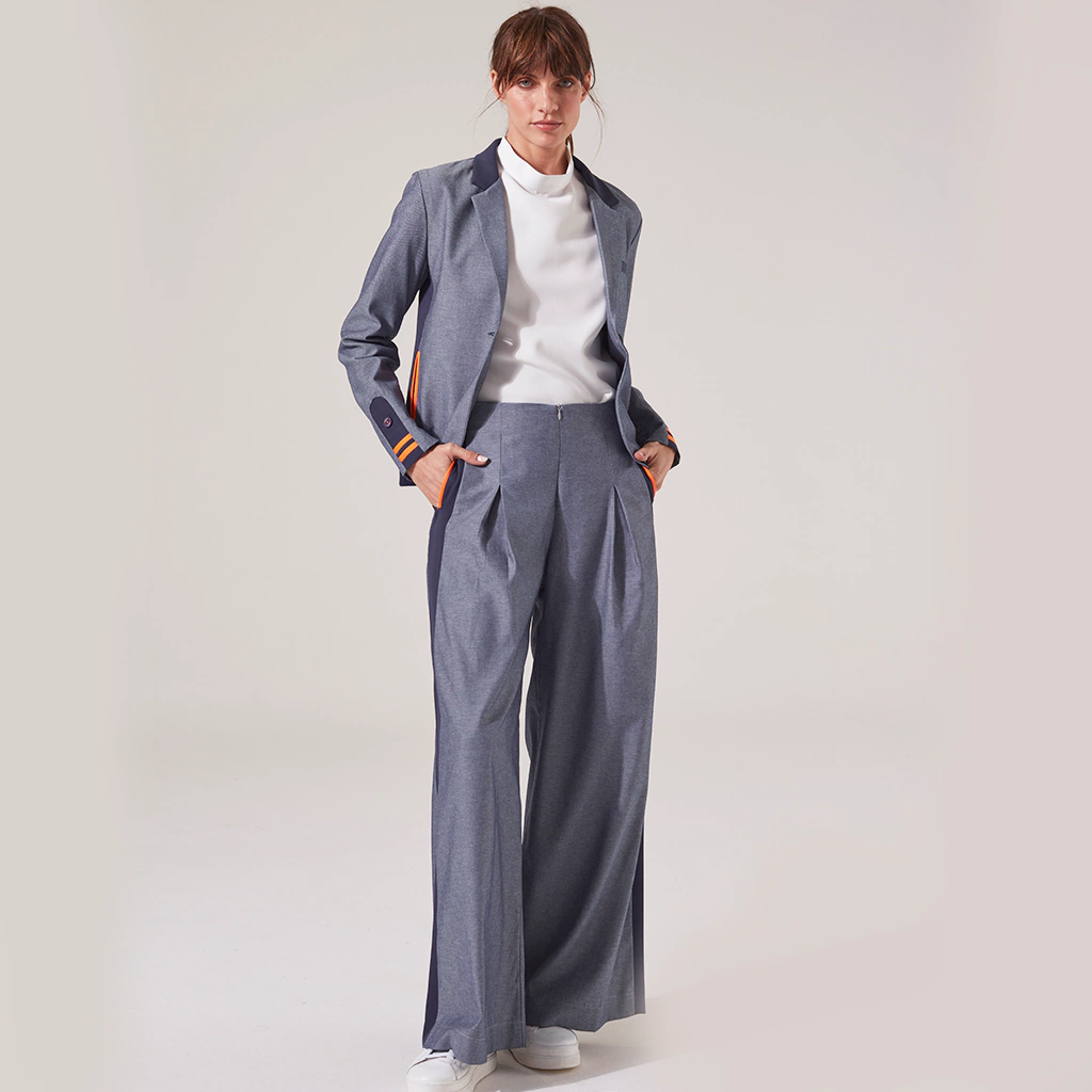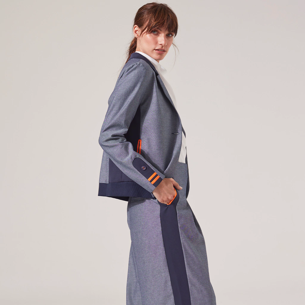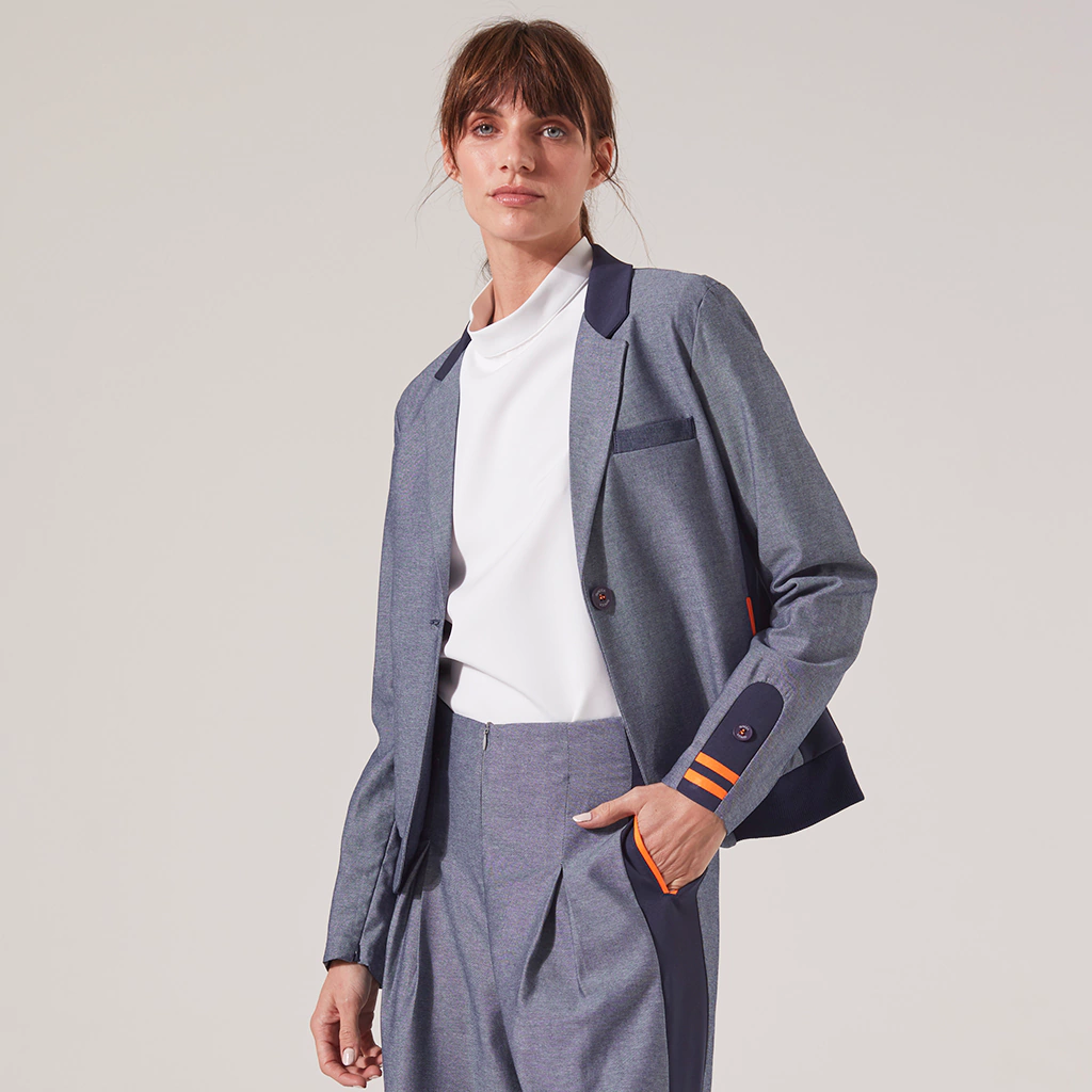 BLAZER CUELLO Y SOLAPA TIPO CAMPERA, CUELLO Y PUÑO DE CINTURA EN RIB AZUL, VIVOS EN MANGA, BOLSILLO LATERAL TIPO OJAL TELA PPAL.: JEAN AZUL DEL REVES TELA COMPLEMENTARIA: SCUBA AZUL - JERSEY NARANJA LARGO DE PRENDA: 60 CM
